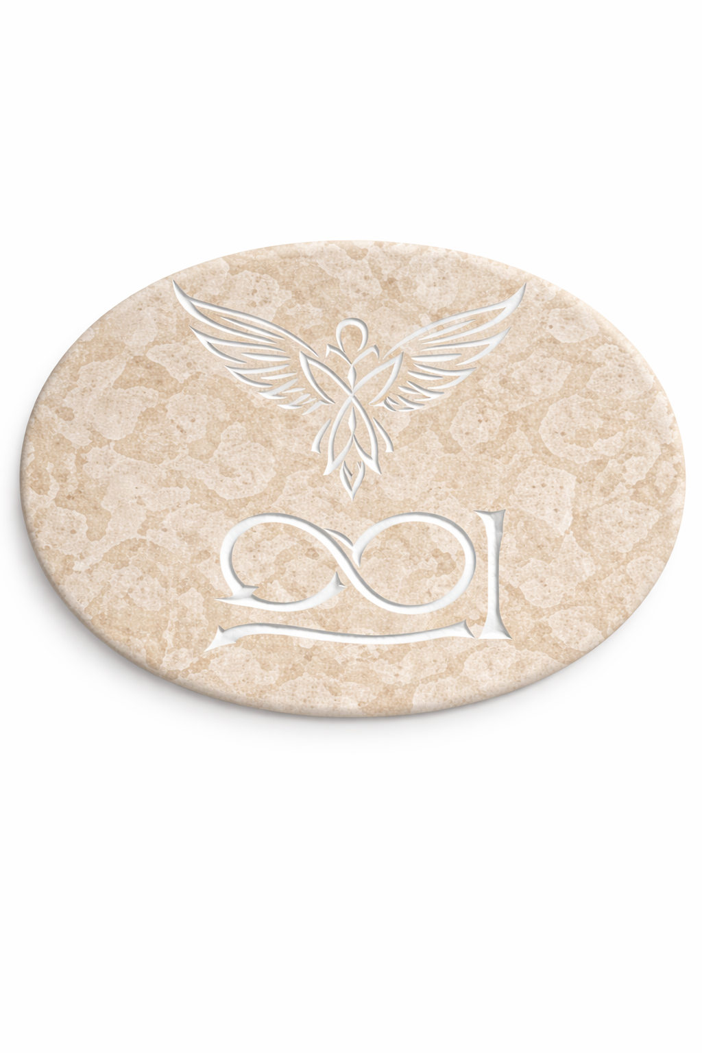 Unikatna kamnita energijska plošča ovalne oblike z gravuro angela varuha in simbola neskončnosti. Oval simbolizira tok, nežnost in naravno gibanje energije, zato ta kos deluje mehko, podporno in harmonično v prostoru.
