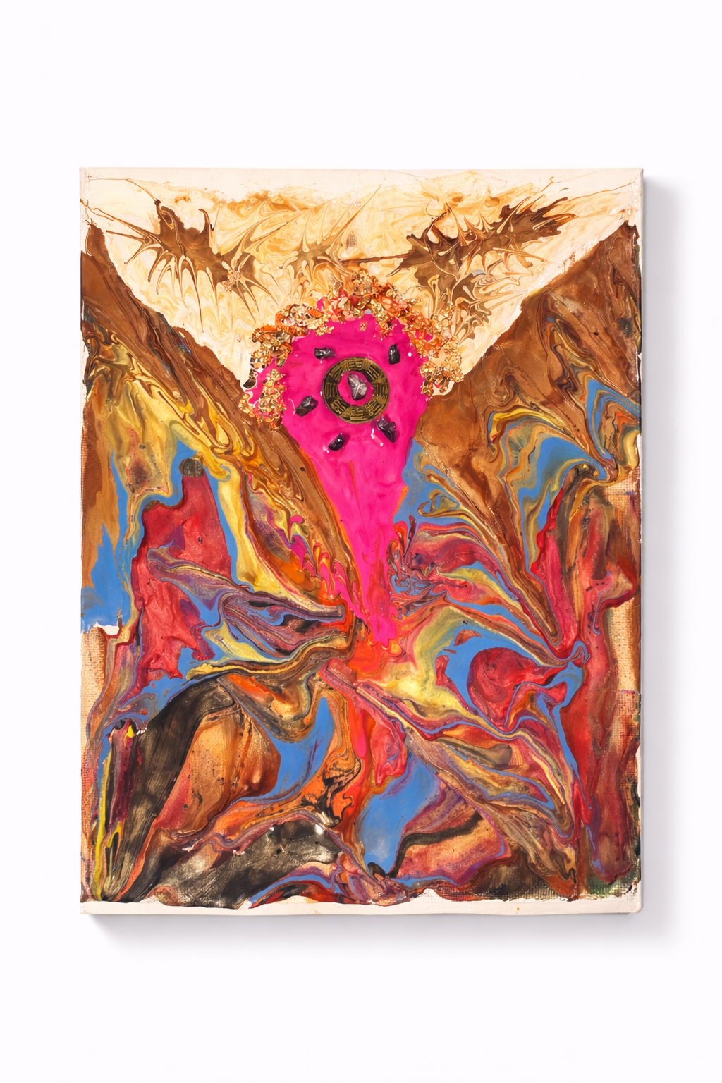 Zemeljska paleta rjavih, zlatih, modrih in rdečkastih tonov sliko prizemlji, medtem ko zlati lističi in kovinski elementi dodajo subtilen sijaj in občutek dragocenosti. Umetnina tako deluje kot sodoben simbol preobrazbe — močna, prisotna in izrazita.
